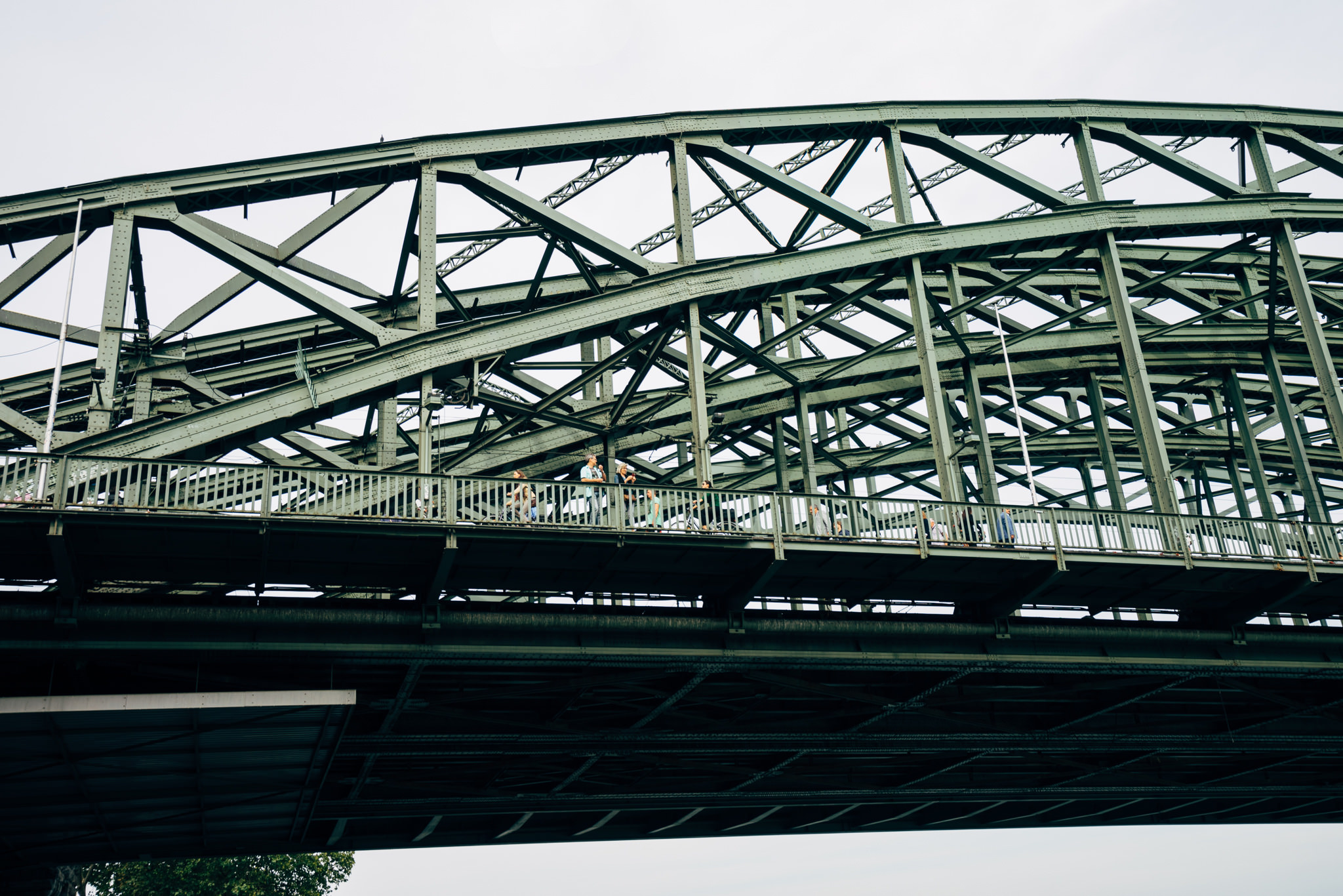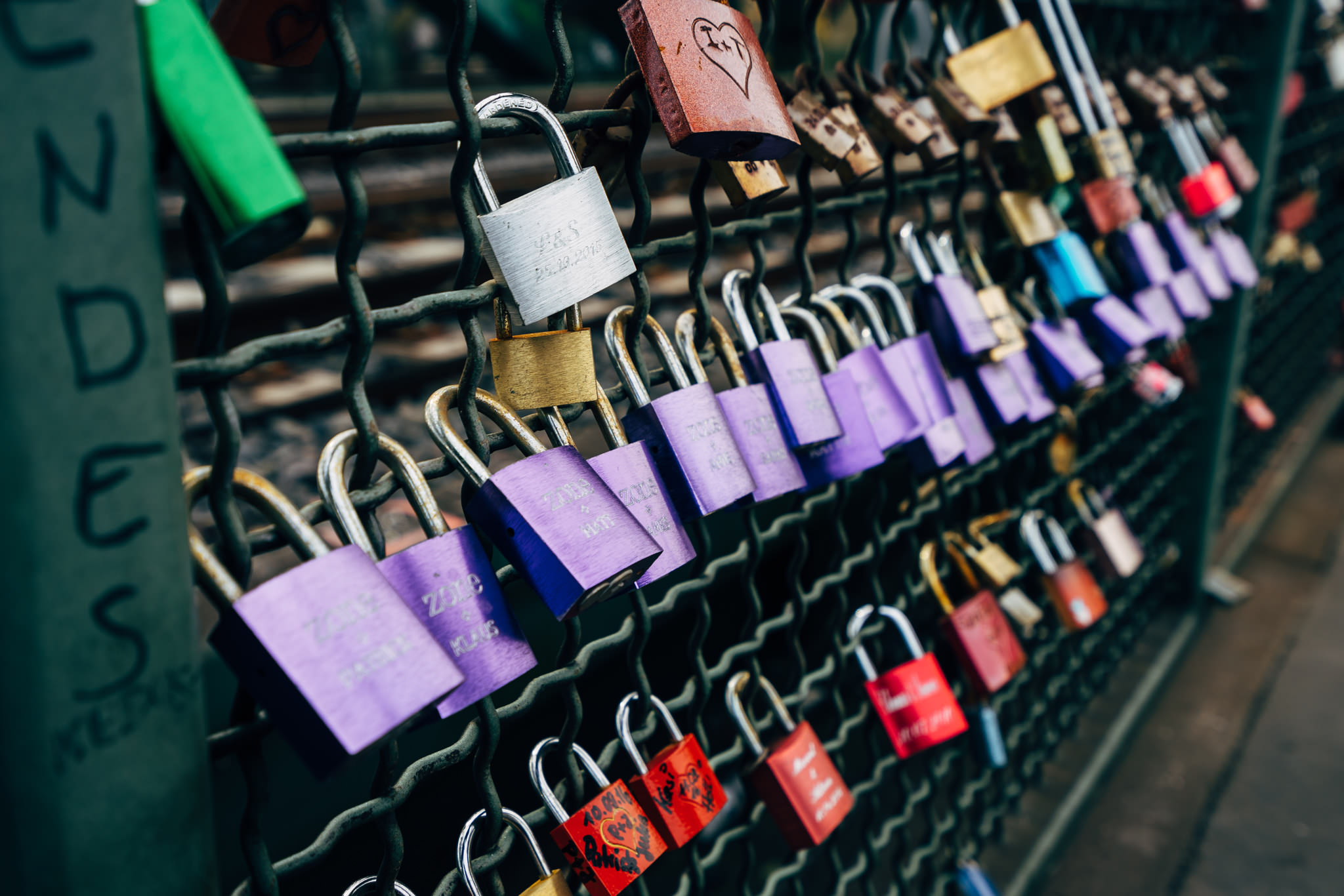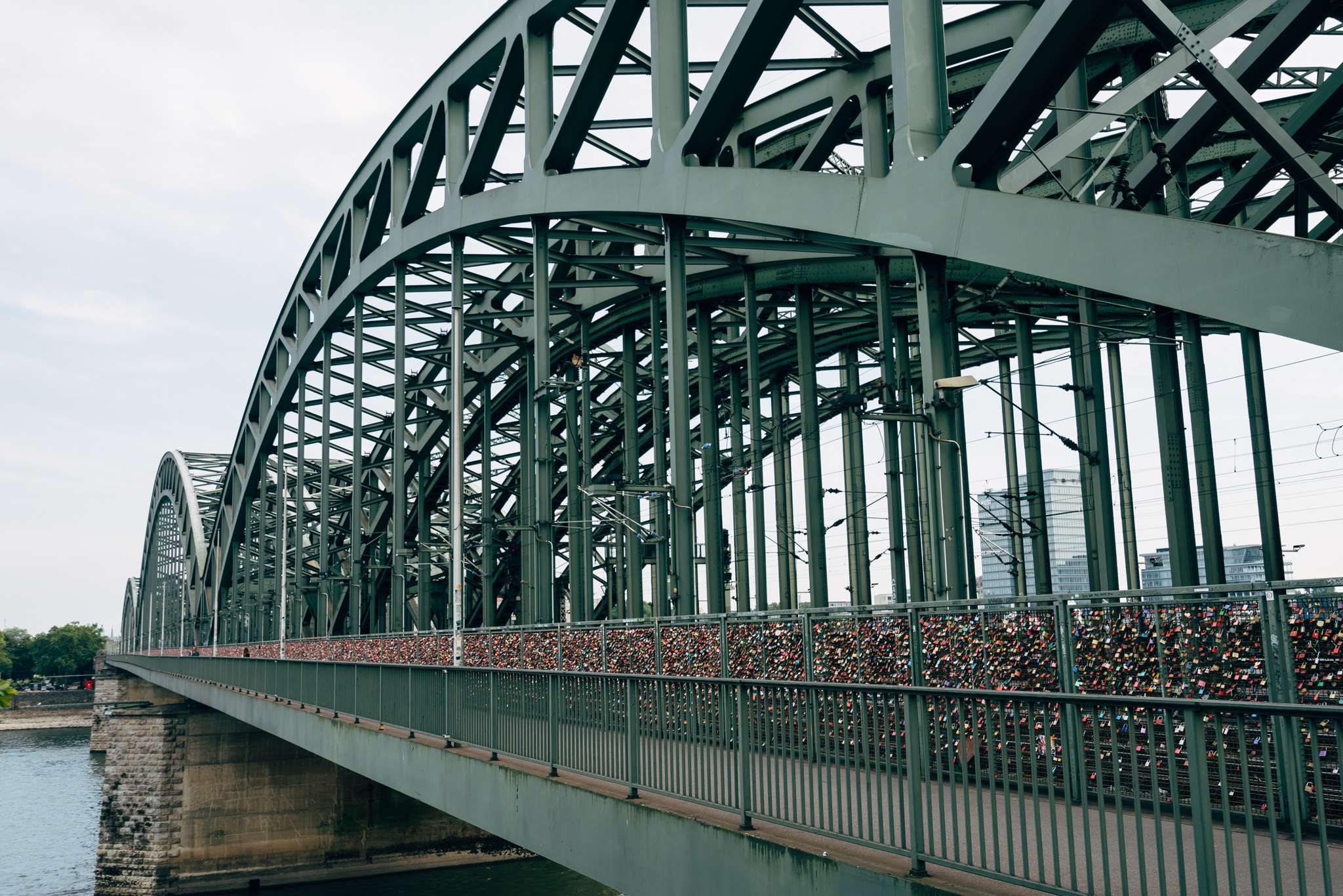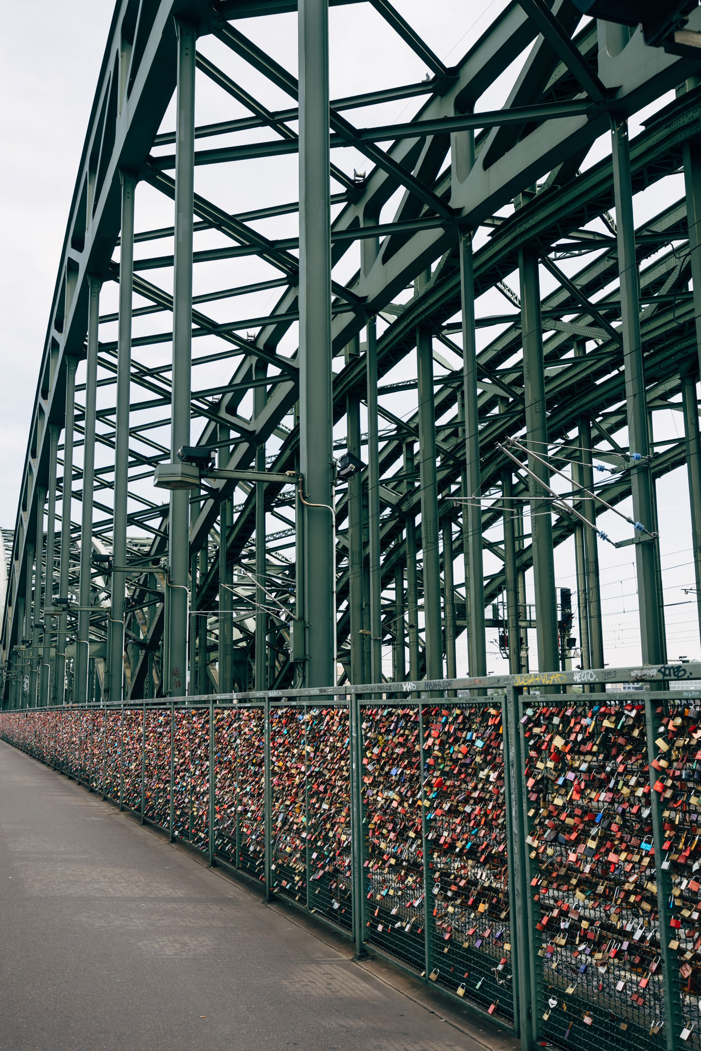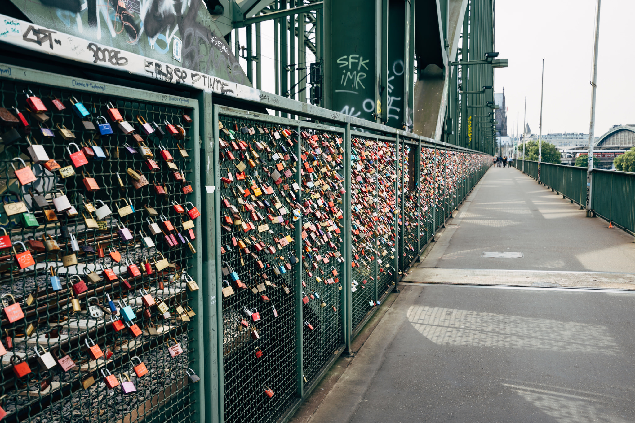 The Hohenzollern Bridge is a bridge for rail traffic and pedestrians. It is the most heavily used railway bridge in Germany with 1200 trains per day. Since 2008, love padlocks have been attached to the railing of the bridge by people.