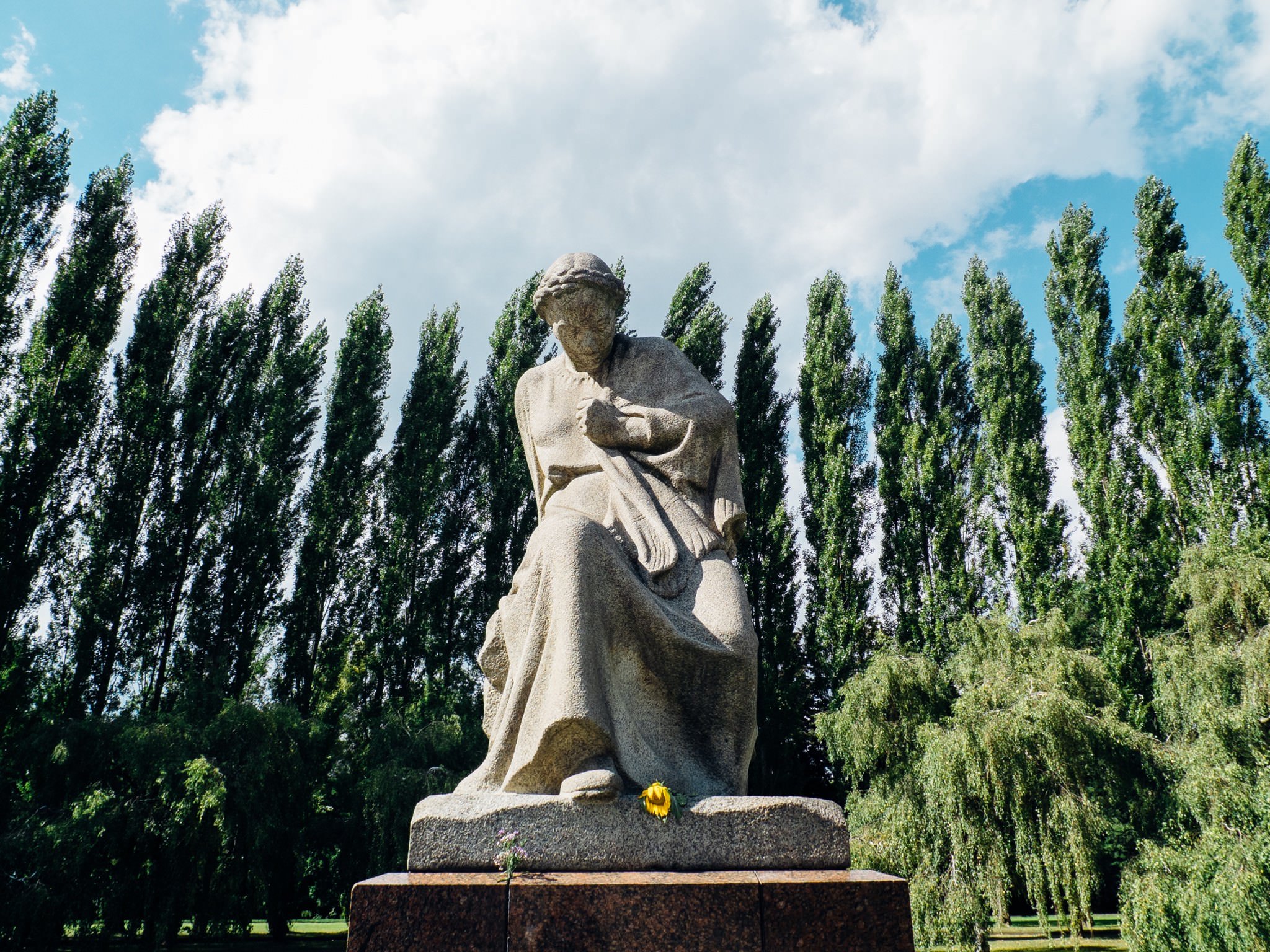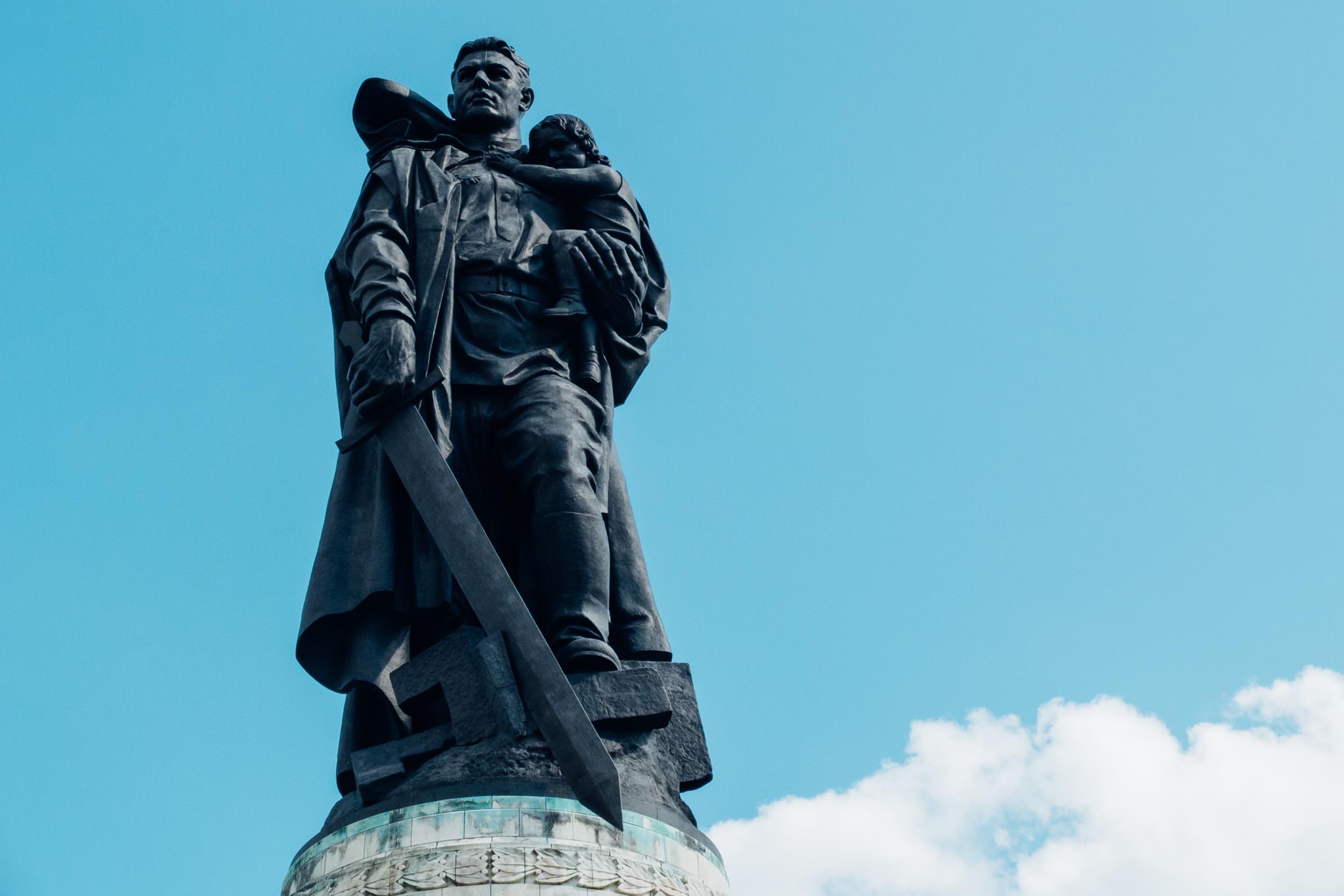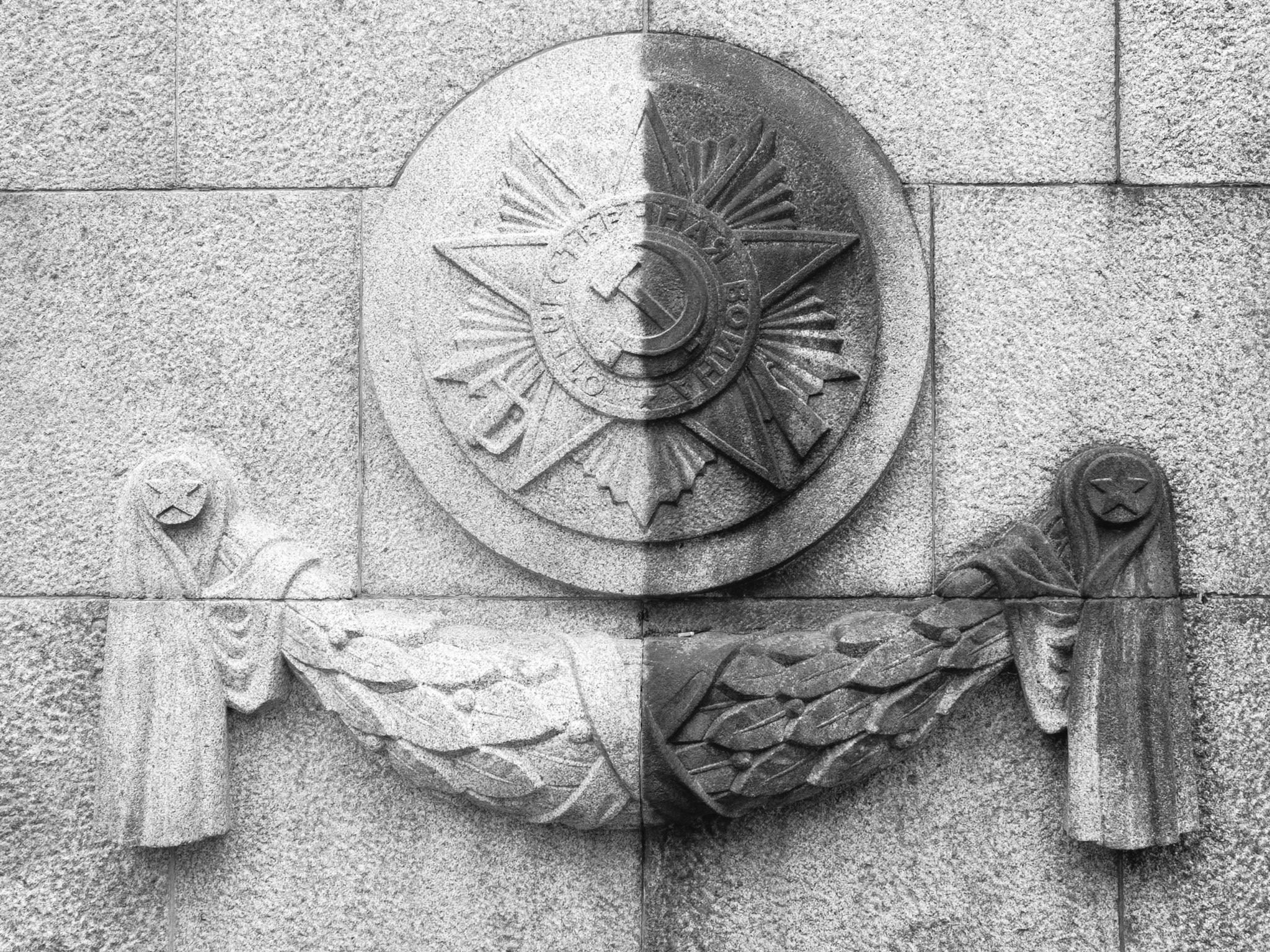 Located on an artificial grass hill is the 12-m tall sculpture "The Liberator" by Yevgeny Vuchetich. It shows a soldier holding a sword in one hand and a small child in the other, below him is a broken swastika.